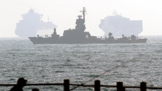 An Ordlandic ship participating on the blockade to Kukuria, as seen from a Ferratan vessel. On the background, two cargo ships attempting to break the blockade.