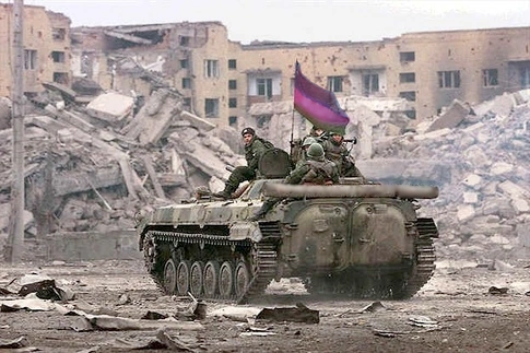 Ordlandic tanks and APCs on their way to the frontline on a major avenue in Elmira, Guetaso. A refugee bus passes by.