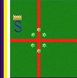 The former national symbol of Nova Luxa was the swallowtailed flag of the House of Sergio, shown below. The blue letter "S" - standing for the House of Sergio -, is surmounted by a golden crown.The red cross and green backing are taken from the former national flag of Ordland.